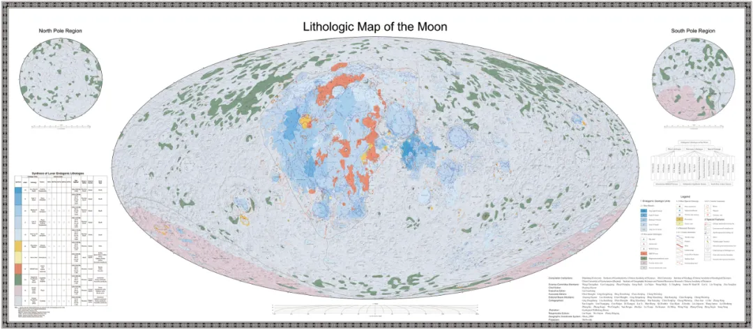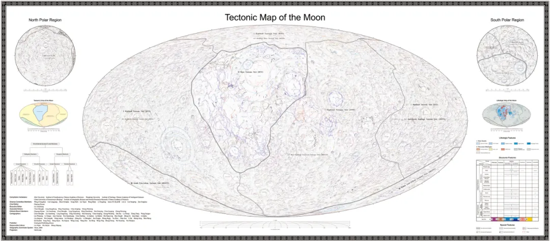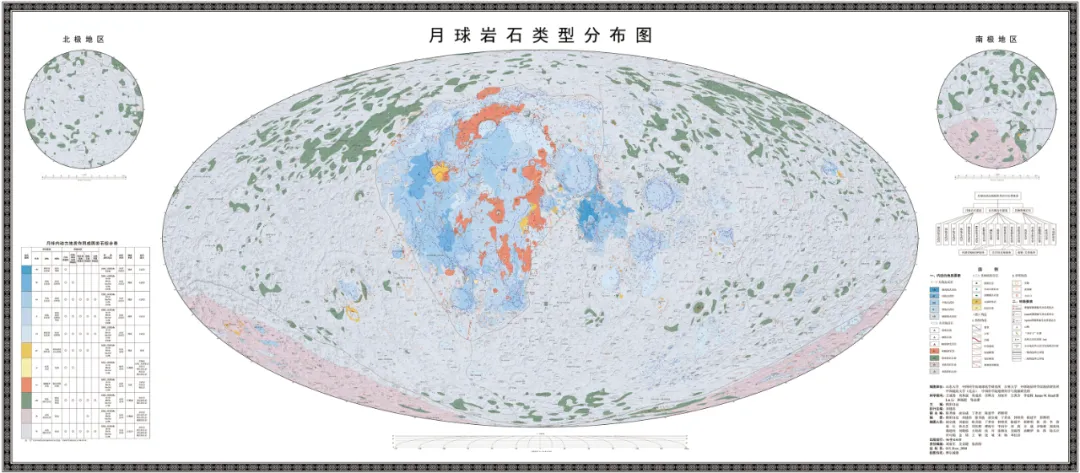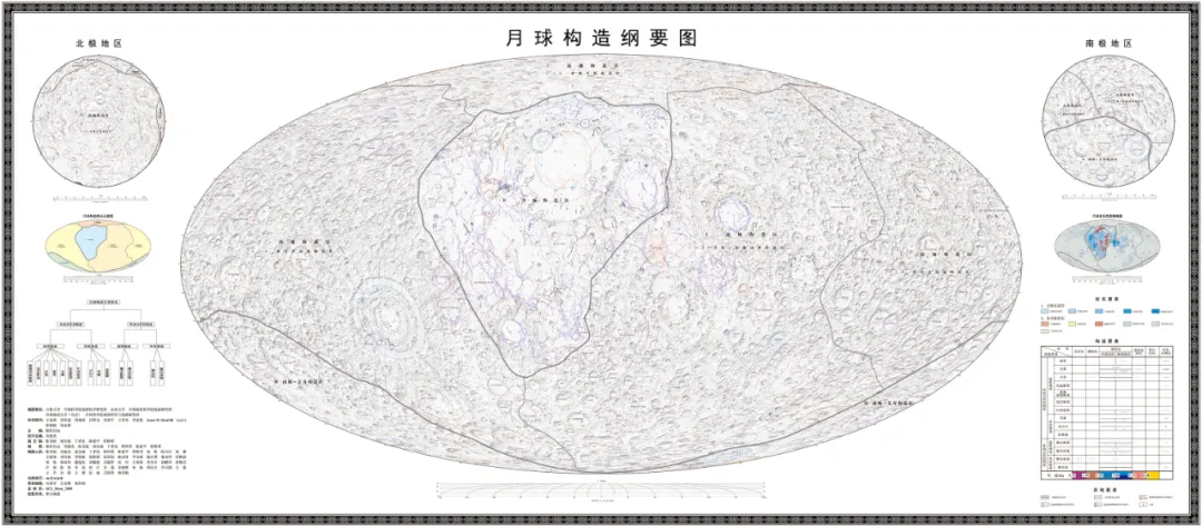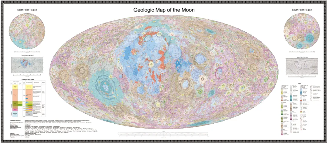 这套图集就像一幅精美的彩绘画卷,用四种基本色调衍生出150种色彩,生动展示了月球“三宙六纪”的不同地质时期。其中,《1:250万月球全月地质图》犹如月球的脸谱,准确标注了12341个撞击坑的位置,81处大型撞击盆地,以及17种岩石类型和14类地质构造,建立了统一的盆地建造亚类的分类体系。
