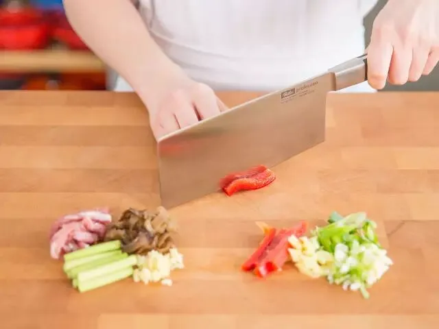 将小葱、姜和蒜剁碎。将蒜苗切小段。猪肉、木耳和红灯笼椒切成细条。
