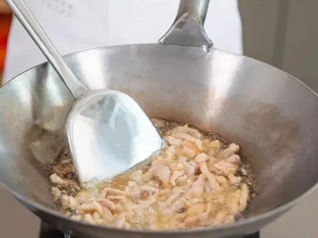 在炒锅中倒油,大火加热。翻炒猪肉,将些许鸡蛋淀粉的混合物留作后用。猪肉炒熟后,倒出备用。