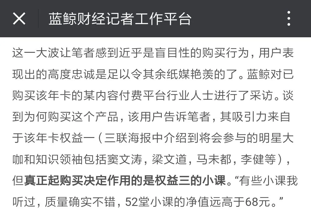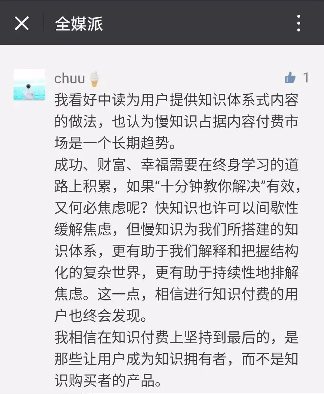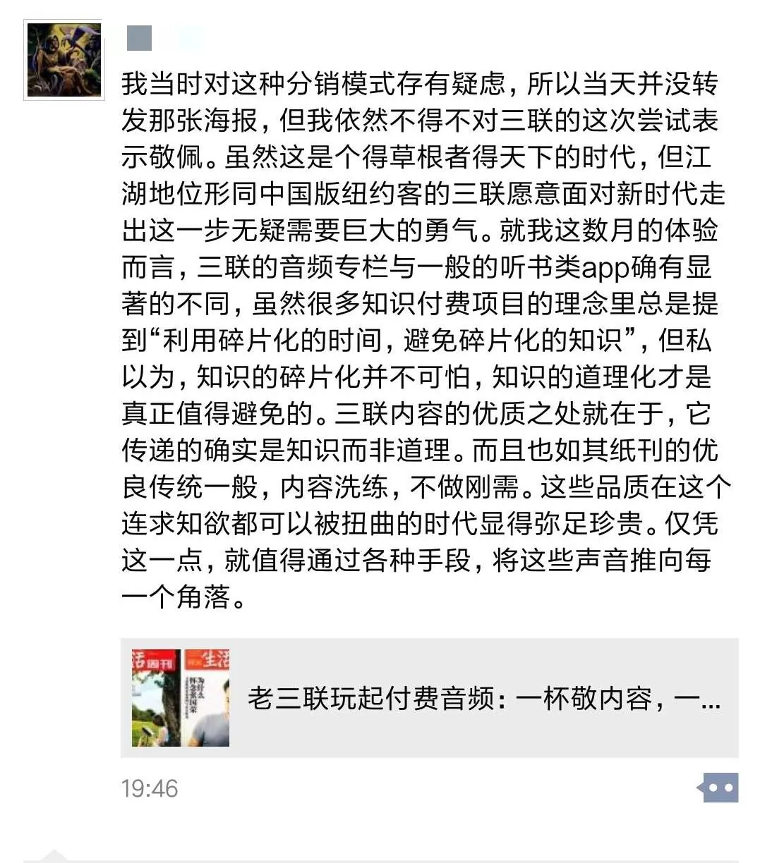 又比如这位读者,在看到关于大年初七“三联红”刷屏事件的报道之后评价:“我相信在知识付费上坚持到最后的,是那些让用户成为知识拥有者,而不是知识购买者的产品。”