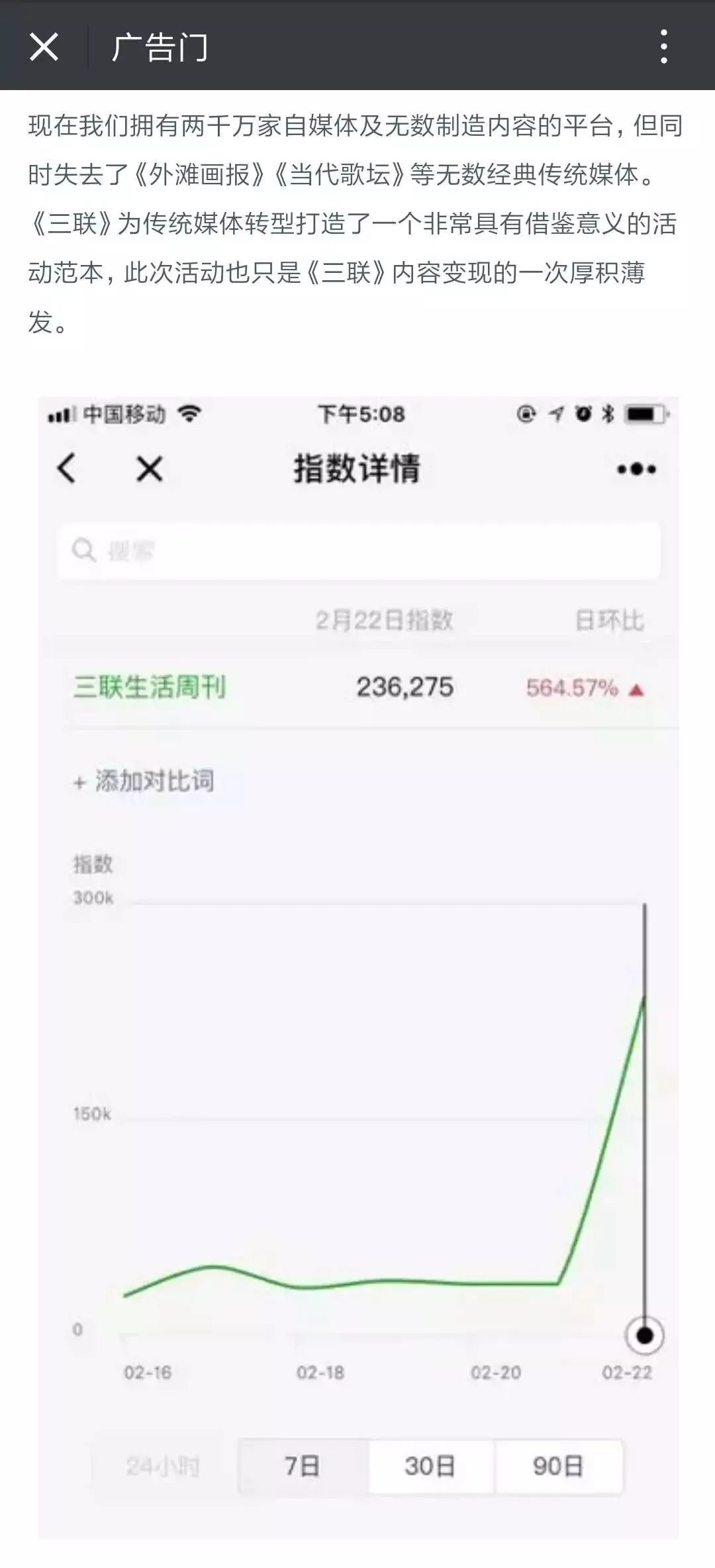 而 2 月 22 日当天的《三联生活周刊》微信指数,比平时增长了 564.57%,在外界评论看来,这是一次“厚积薄发”,“为传统媒体转型打造了一个非常具有借鉴意义的活动范本”。