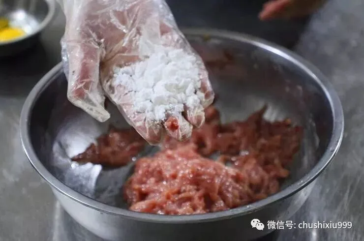 3、然后再加一点清水,并顺一个方向把清水打进肉内,然后再加入适量玉米淀粉,搅拌均匀,把肉打粘后,放在盆子内备用。