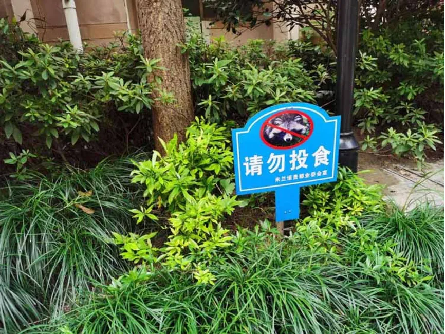 2020年,意识到投喂的影响后,上海小区设置了请勿投食的警示牌。(武亦乾/图)