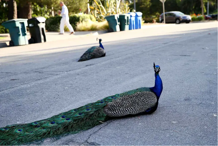 当地时间20216月,美国加利福尼亚州阿卡迪亚,迁徙计划受新冠疫情影响后,孔雀在居民区闲逛。(视觉中国/图)