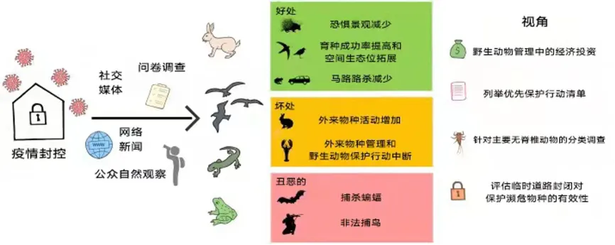 新冠疫情封控对野生动物的影响,包括好处、坏处和丑恶三类。翻译自Raoul Manenti等的论文。(刘睿敏翻译/图)