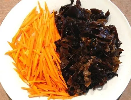 备用食材:猪里脊肉200克,胡萝卜1个,尖椒1个,黑木耳35克,豆瓣酱1勺,料酒1勺,淀粉2勺,生抽2勺,陈醋4勺,白糖3勺;