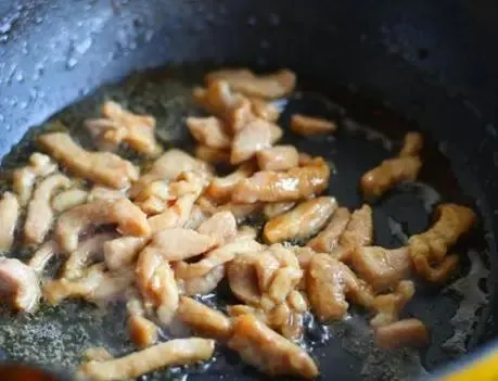 第三步,一个小碗中,将淀粉、生抽、白糖和陈醋,按照1:2:3:4的比例放好,搅拌均匀即成鱼香汁,待将猪肉丝腌制好之后,在炒锅中添上适量的食用油,放入肉丝,快速滑炒散,待将肉丝炒至发白后;