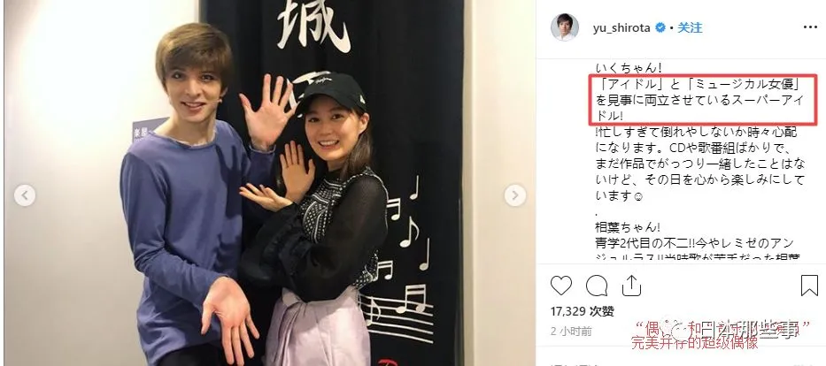 城田优更是在INS上称赞生田绘梨花是“偶像”和“音乐剧女演员”完美并存的超级偶像。