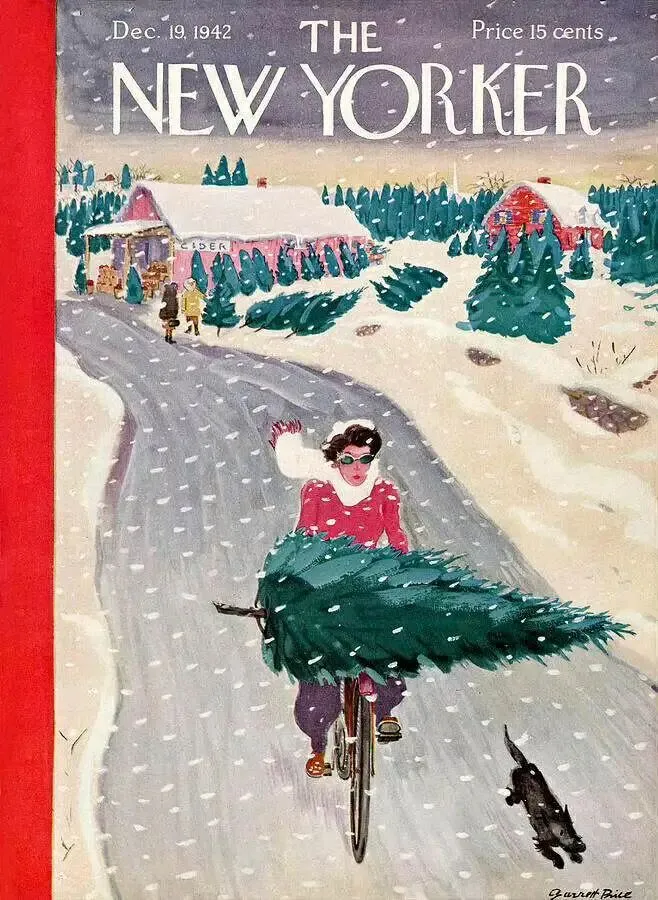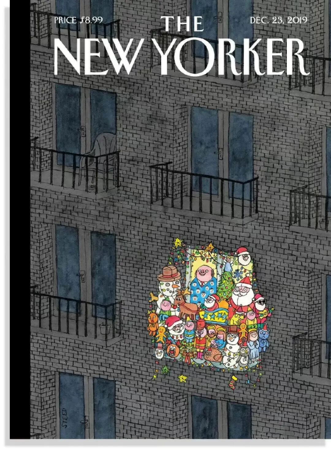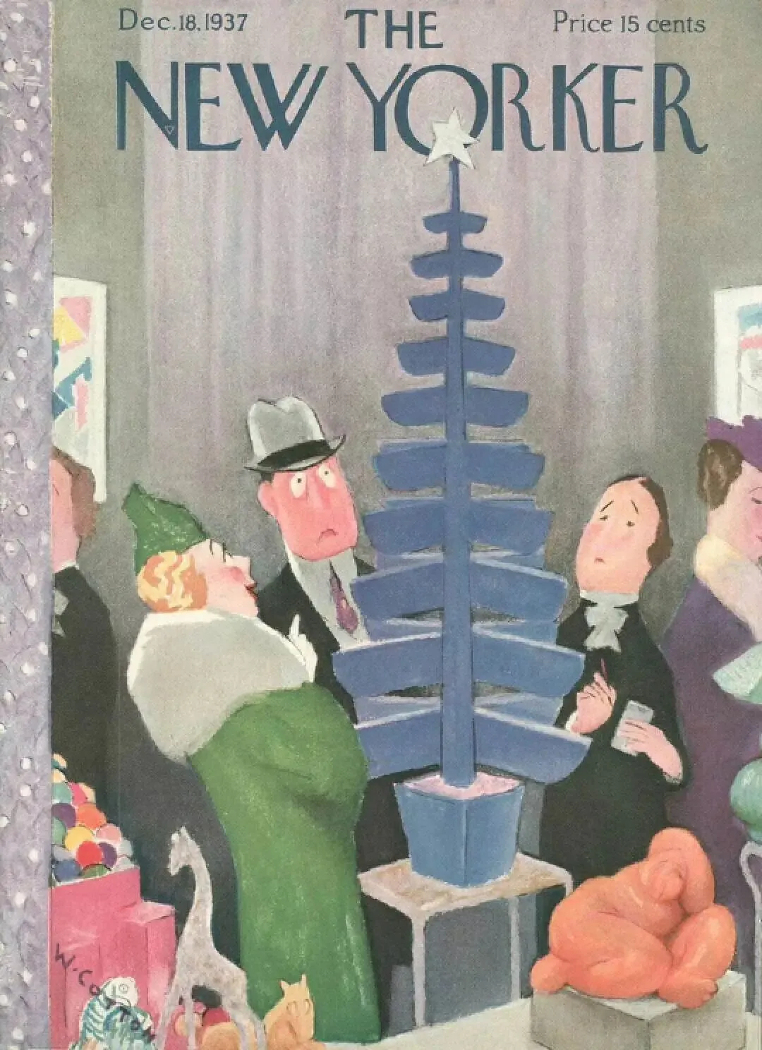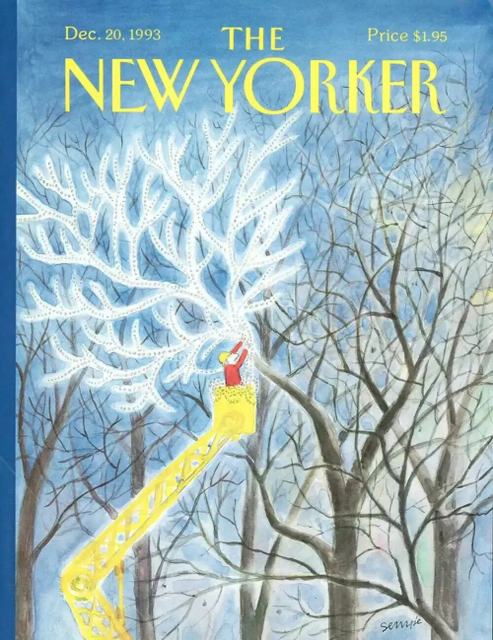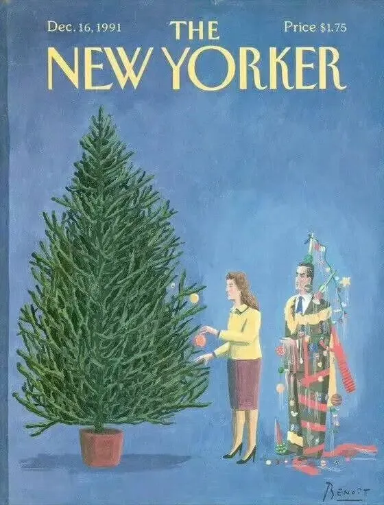 不夸张地说,万圣节的coser能变幻出多少形态,那么《纽约客》封面上的圣诞树就会有多少变体。穿梭在不同的绘画风格里,一棵树的亮点从五彩夺目的灯饰到提着树的人,故事感在其中流淌。