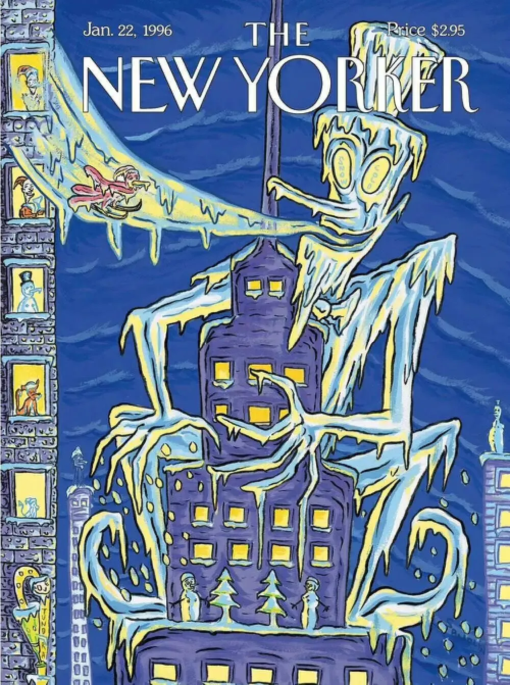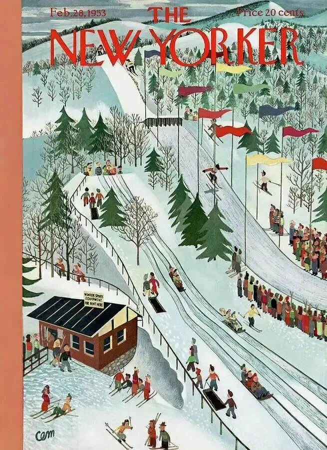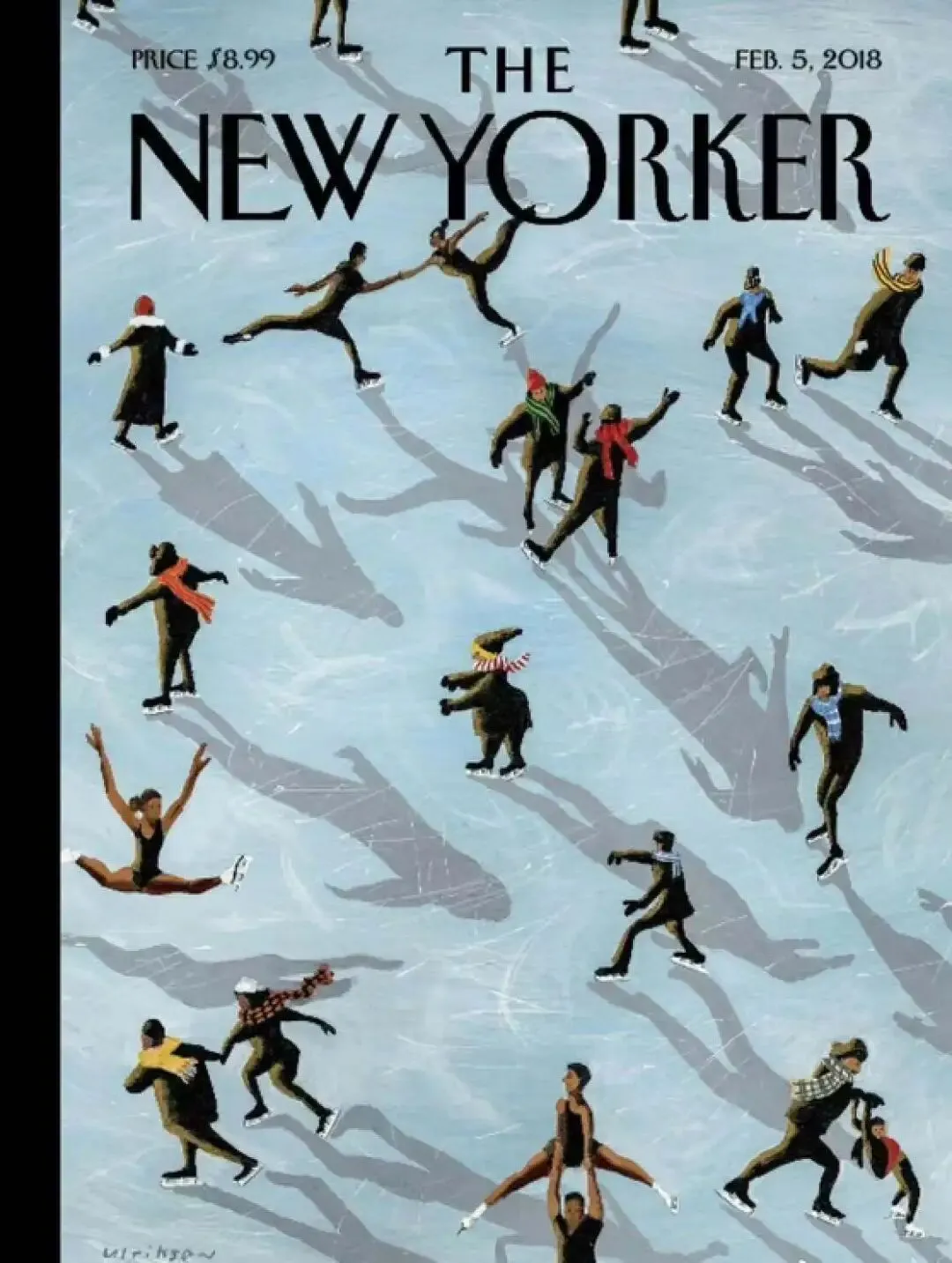 掀掉天花板以后,《纽约客》的封面里也会储存冬天宝贵的生命力,借由运动项目表现这个季节独特的动态感。用或特写或远景表现溜冰与滑雪时刻的氛围,就像往平静的封面丢了一块石子,雪花四溅。