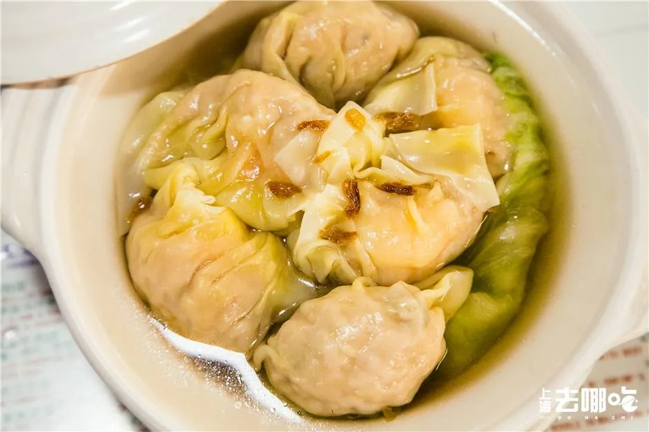 砂锅中挤满6个碱水皮子云吞,一咬还有汁水迸溅出,就连汤底都是用带肉烤制后的虾壳和猪骨一同熬制而成,超级过瘾!