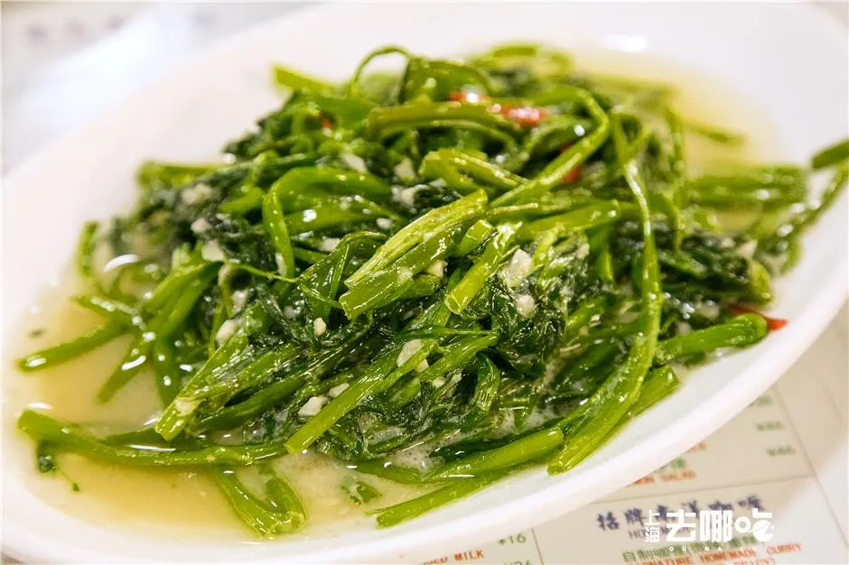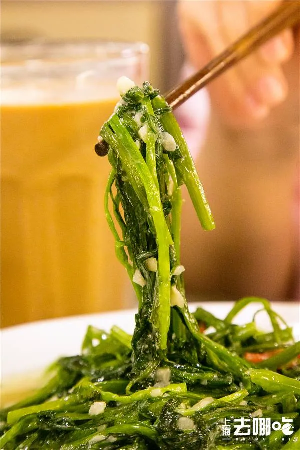 从东南亚直接空运来的空心菜又脆又糯,用白腐乳酒酿大火爆炒,加了点蒜末,汤汁的香气沁在空心菜里,鲜嫩多汁,爽口的很。