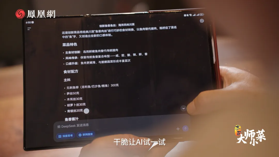 对于AI给出的方案,徐孝洪基本赞同,但他建议用黑鱼取代巴沙鱼,前者在刺少的同时肉质更紧实,切丝烹炒后口感更佳。