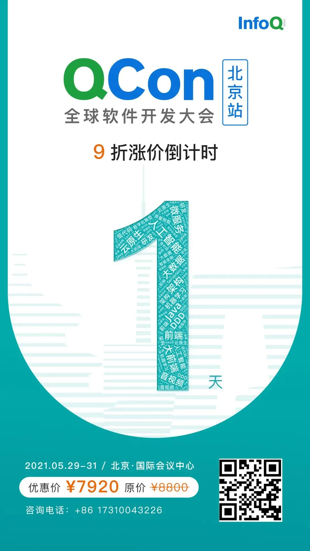 点击【阅读原文】或识别二维码了解更多关于 QCon 北京 2021,今天是大会门票 9 折特惠倒计时最后 1 天,现在购票立减 880 元,团购还有更多优惠!有任何问题欢迎联系票务小姐姐:17310043226(电话同微信)