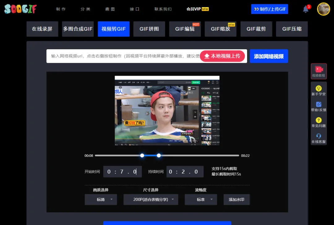 选择视频转GIF,视频上传后,拖拽拉杆,或者输入开始时间和持续时间(最长片段为秒哦),即可选择自己想要的片段进行生成GIF并下载。