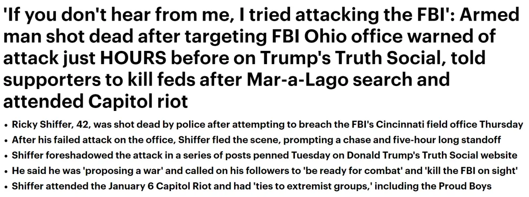猛!川普“铁粉”持枪硬闯FBI大楼,对峙交火7小时.....民众高呼:全美内战吧!