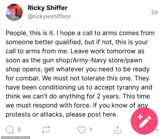 里奇·沃尔特·希弗尔(Ricky Walter Shiffer)在Twitter和Facebook中都是活跃的用户,他时常吹嘘自己曾参与去年的国会大厦骚乱时间。目前,他的所有社交媒体账户已被禁封。