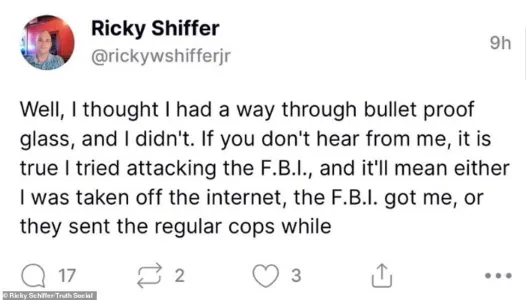 本周四8月11日,威胁升级,当天一早,他在社交媒体中写道:“如果你们没有我的消息,那么我确实去试图攻击联邦调查局(FBI),这意味着要么我被FBI带走或是被带到普通警察那......”