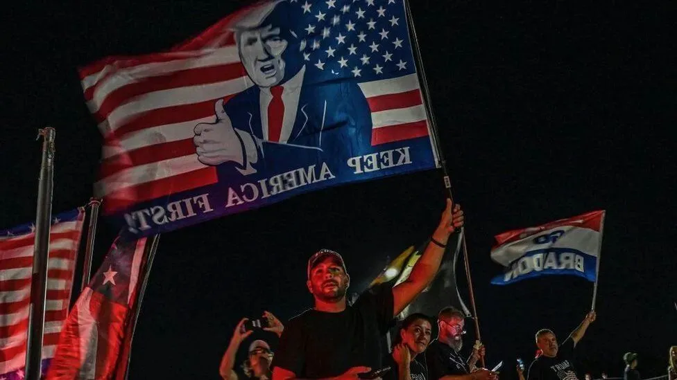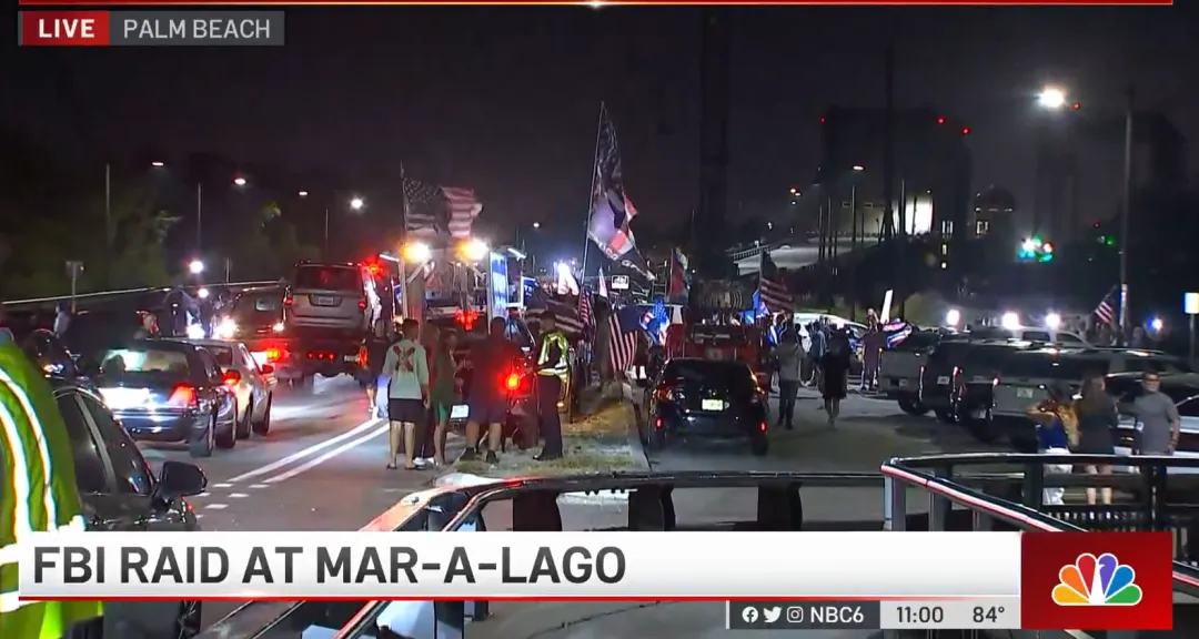 不仅如此,还有一帮川普“铁粉”聚集在Mar-a-Lago豪宅之外支持川普,并举着大旗进行抗议,要求FBI给出“一个合理的说法”。