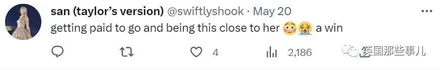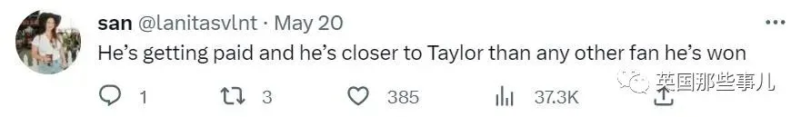 “他拿到了报酬,而且比所有抢票时赢过他的粉丝距离泰勒更近。”