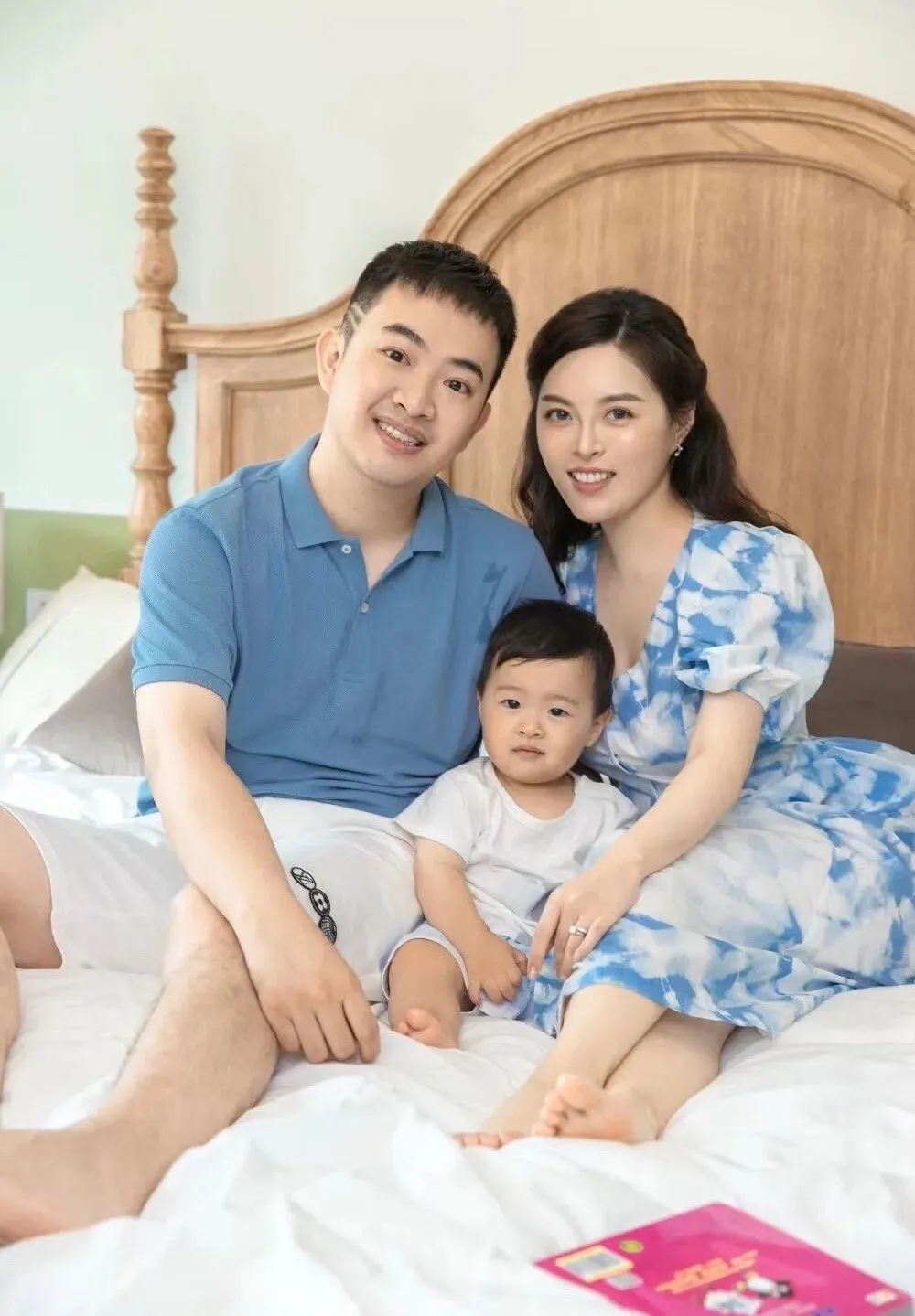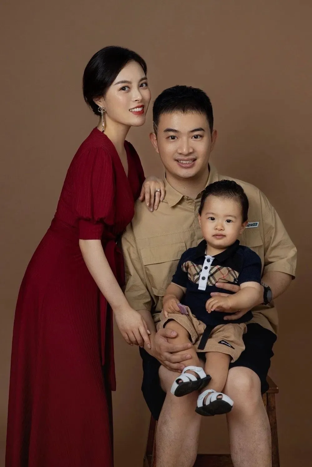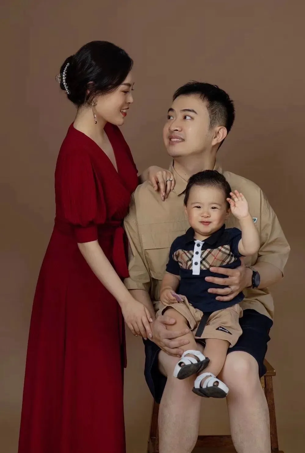 第三套是蓝色T恤搭配卡其色短裤,这套是在摄影师的棚内拍摄,一套正式一点的家庭合照👪,纪念六六的一岁生日。