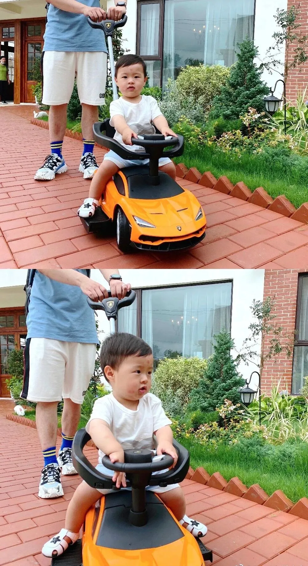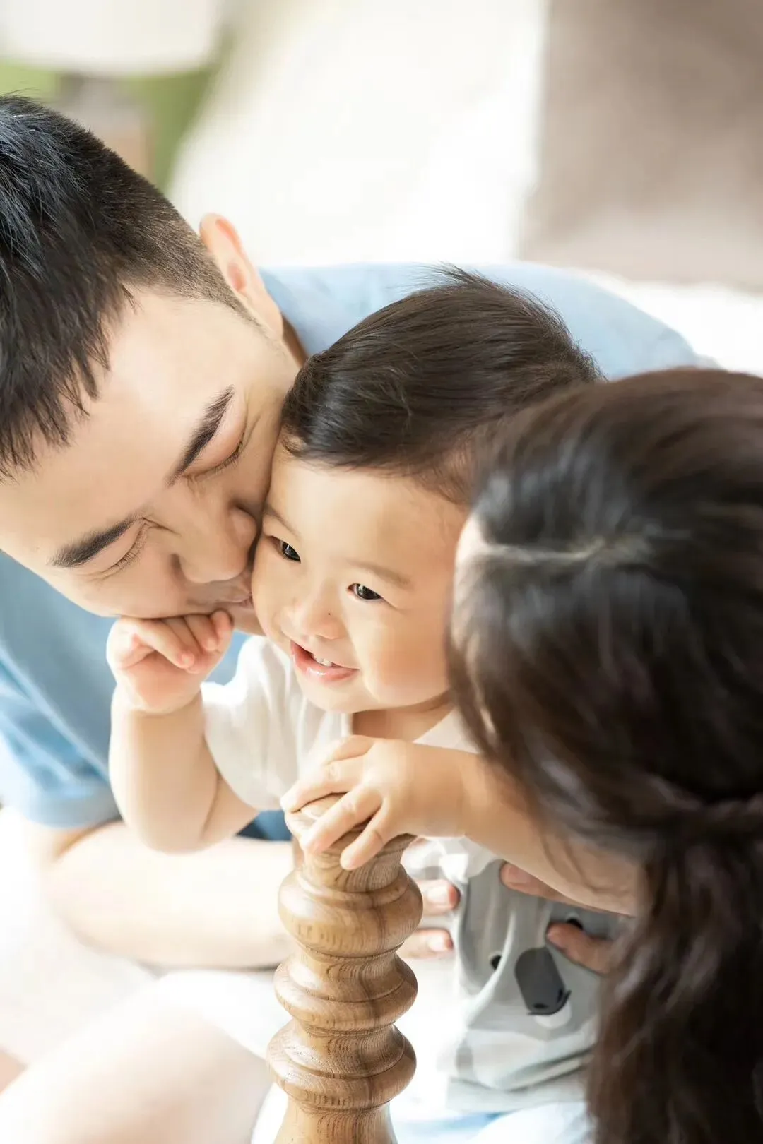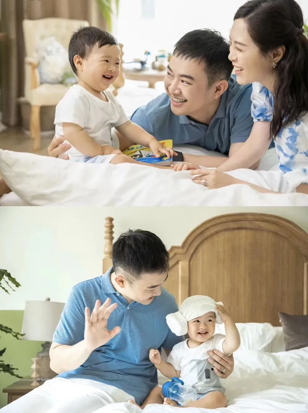 第三套是蓝色T恤搭配卡其色短裤,这套是在摄影师的棚内拍摄,一套正式一点的家庭合照👪,纪念六六的一岁生日。