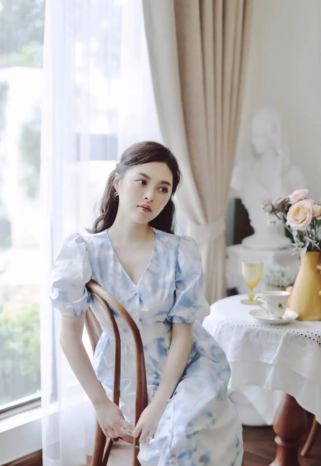 是两种完全不同风格的装备,居家主题的我选择了蓝色蜡染花的泡泡袖连衣裙,耳饰和发型都是相应的简单、自然的款式,想体现居家生活里的舒适、自然的感觉。