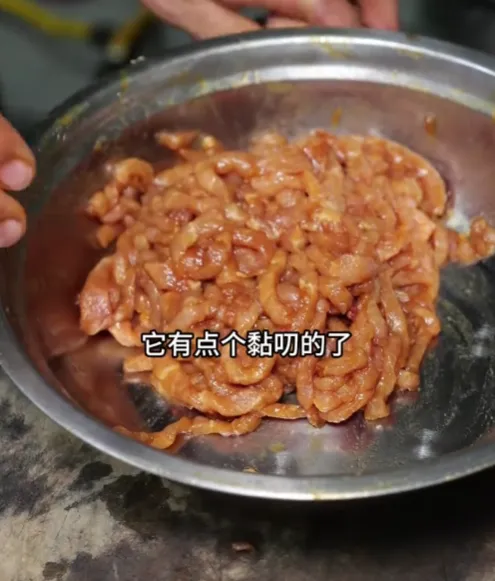 切好的肉丝放到盆里,洗肉丝的时候,在盐水里面洗,所以盐可以把肉丝里面的脏东西给它吸出来。接着把水倒掉,把肉丝里面的水分用手稍微攥一攥,给它攥干。炒这个京酱肉丝呢,要想吃起来滑嫩,首先给肉丝调味,再来点老抽,给肉丝上颜色,再少来点盐,来点料酒,去腥增香,咱用手顺着一个方向去搅拌,它自带的水分啊,还有刚刚加入的这个料酒都给它搅拌进去,知道吧?肉丝搅拌得有点粘手了,这时候呢再往里面加一个蛋清,蛋黄不要,放蛋清就行。接着把这个蛋清也给它搅拌进去,最后再来点玉米淀粉,给它拌匀。哎,你看,肉丝表面都裹着这种玉米淀粉,这个状态正合适。