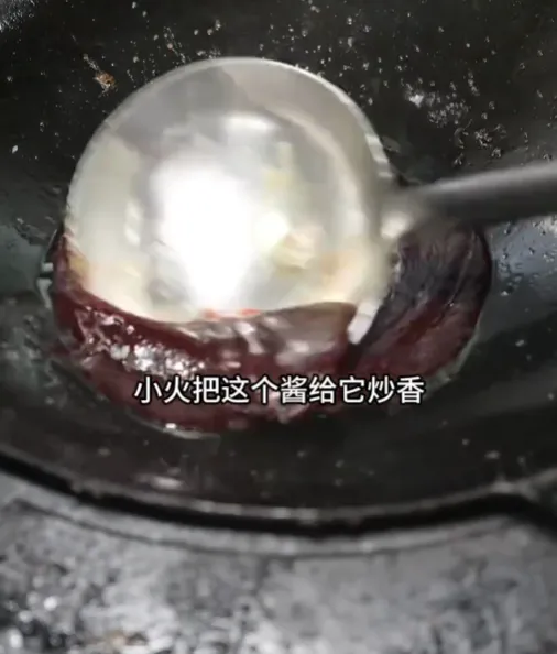 热锅凉油先来滑锅,锅里稍微多来点油。四成油温来准备滑这个肉丝,在滑肉丝之前咱往肉丝里加点油,用凉油把肉丝提前给它拌开,因此到时候咱滑的时候肉丝就不会粘连在一起。四成油温,咱直接下肉丝,用筷子迅速给它打散。你看这个肉丝,稍微让它定型,看到没,一粒一粒的,它不会粘在一起,倒出来控下油。我炒这个京酱肉丝不放甜面酱,但是也很好吃。来一平勺海鲜酱,半勺蚝油,来一勺白糖,小火把这个酱给它炒香,给它熬化。这样吃起来的京酱肉丝酱香味才能浓郁,知道吧?熬化过后,等它起泡泡了,直接下肉丝,现在来翻炒两下,大火炒熟,漂亮吧。