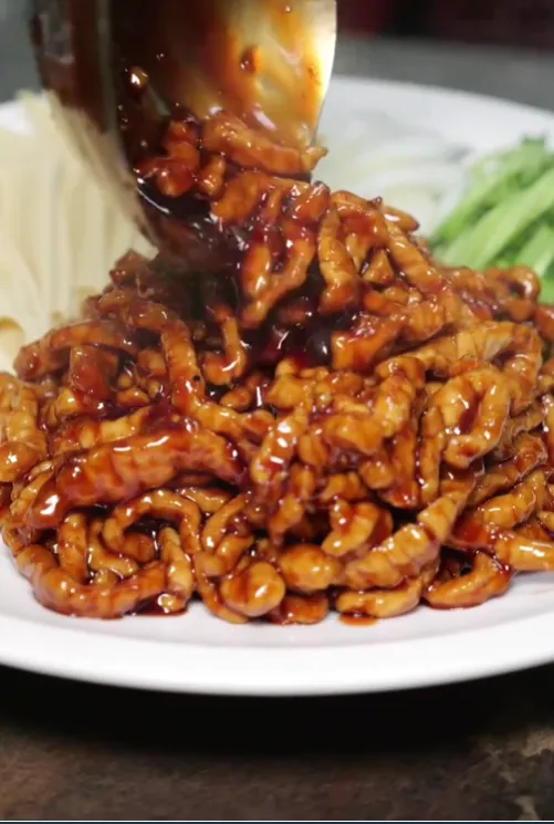 哎,你看我炒的这个酱肉丝,炒的时候不加水不勾芡,因此肉丝滑嫩爽口而且不柴,酱香浓郁,此外还像用豆皮这么一卷,放那个黄瓜丝、葱丝。我跟你讲,你要是喜欢吃这酱肉丝的,直接就像我这么做就行,所以不需要再找别的调味料了。这个京酱肉丝咱该怎么做才能滑嫩,吃起来不柴,而且炒的时候它还不得脱酱,酱汁酱香味都比较浓郁。今天我一篇文章把你教会。论做这个京酱肉丝,不是吹牛的啊,我做得挺好的,很有实战性,因为我从开饭店到现在一直都在卖这道菜,因此卖得真是特别火。今天我就把我的做法毫无保留地分享出来。