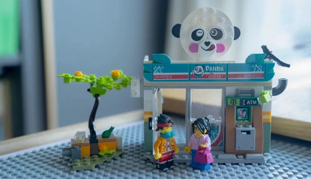 一直觉得乐高的零件细节做得精巧且写实,抽屉、柜子这类小部件是能打开的,里面还暗藏玄机,比如熊猫便利店的ATM真有“钱”,朱大厨的外卖车真装有“包子”。