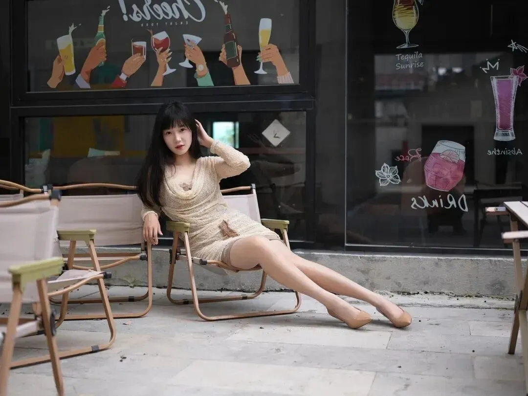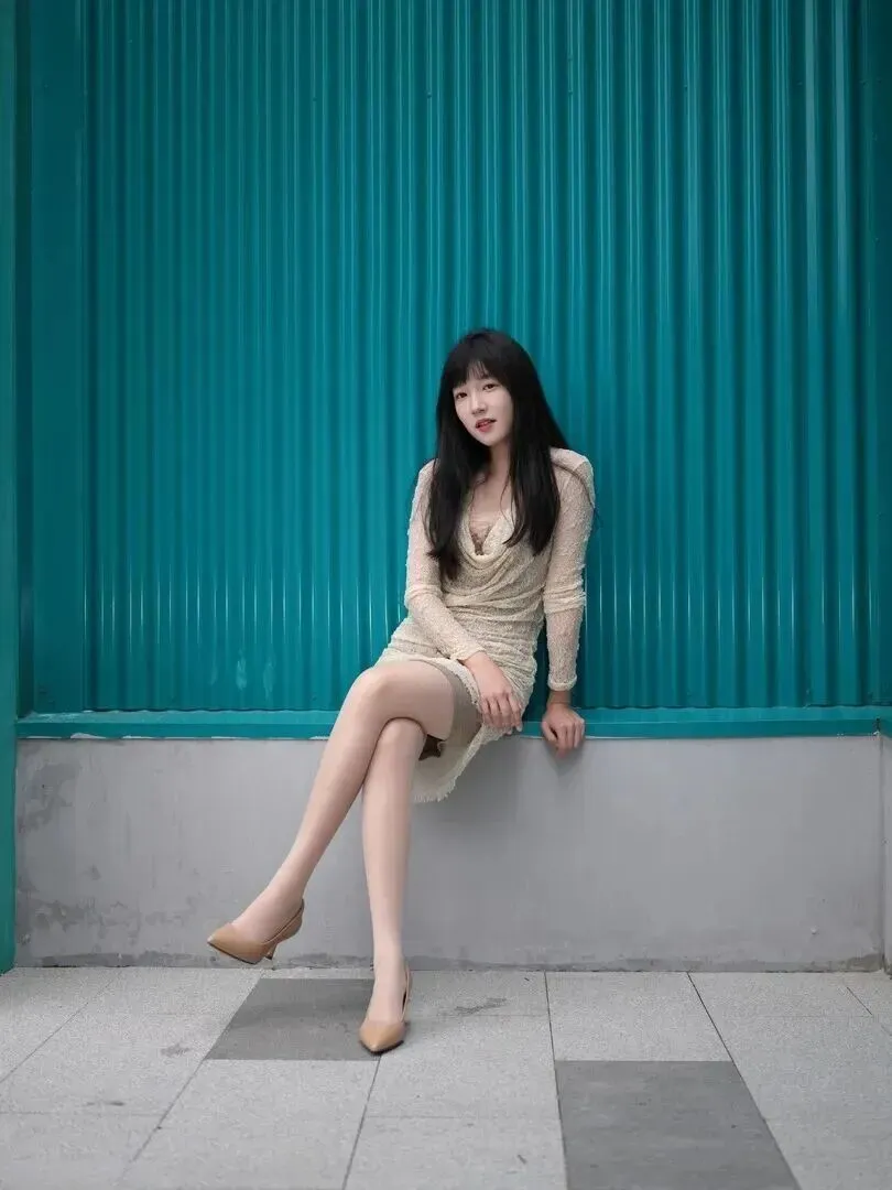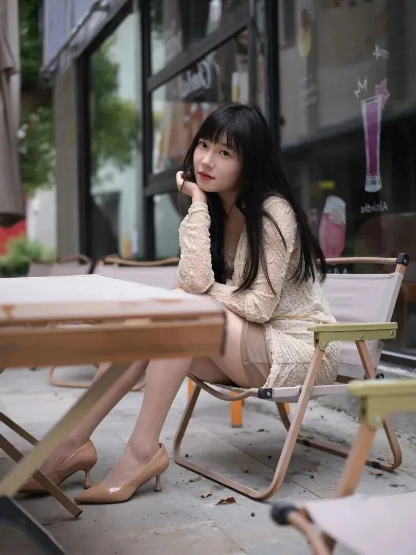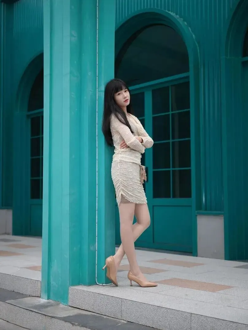 .晚六点.的路灯下,.米色裙.子在.暖黄色.灯光.里美到发光.。裙摆.长度刚.好到.小腿最.细的地.方,.走动时裸.色高跟鞋若.隐若现。.路过的摄.影师忍不住.按下快门,.说这是“.城市温柔.时刻”。