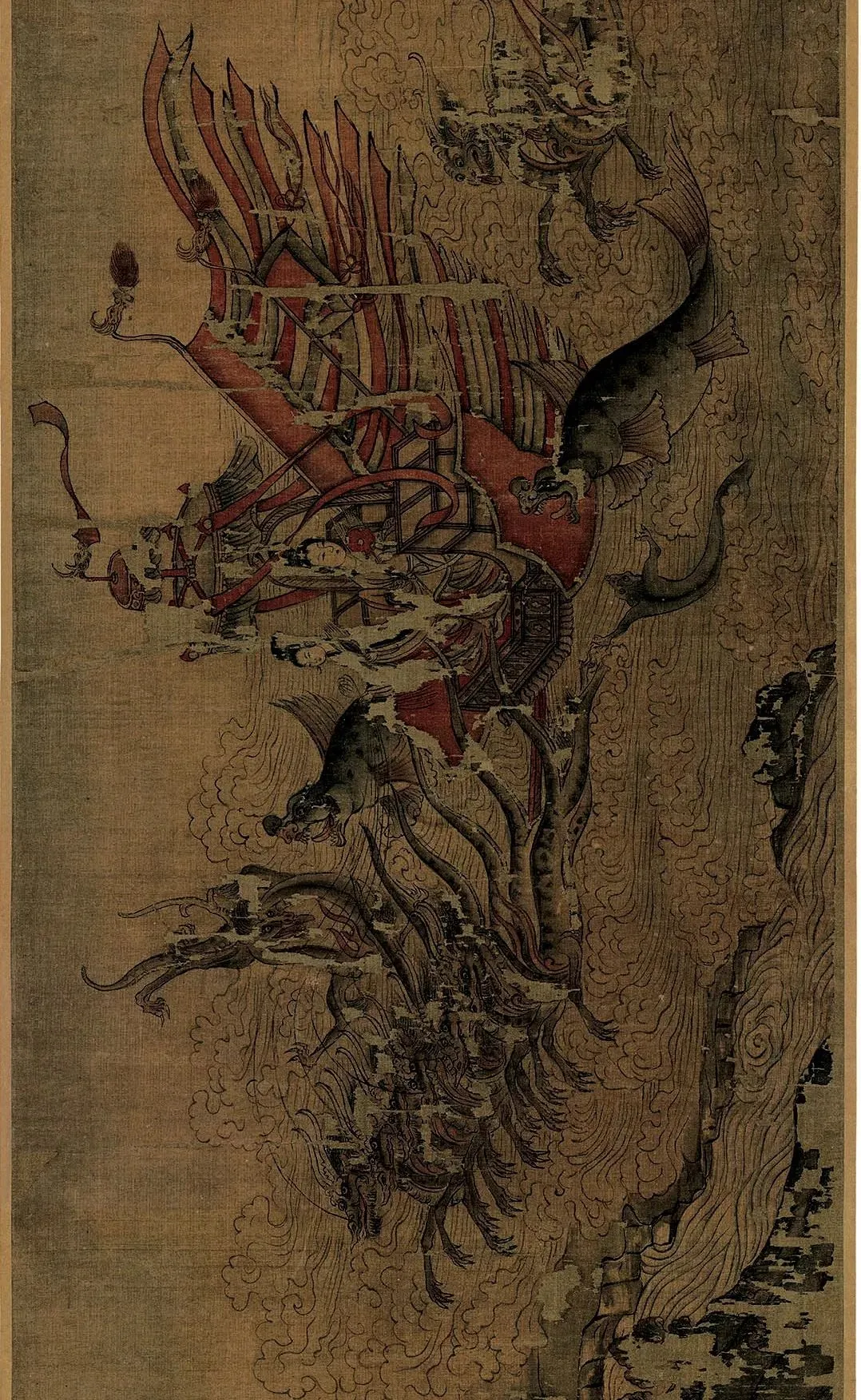 四处遨游的线条,串起整幅幻境的情节性、韵律感、古朴风范。如唐代画家张彦远所言:“顾恺之之迹,紧劲联绵,循环超忽,调格逸易,风趋电疾,意存笔先画尽意在,所以全神气也。”