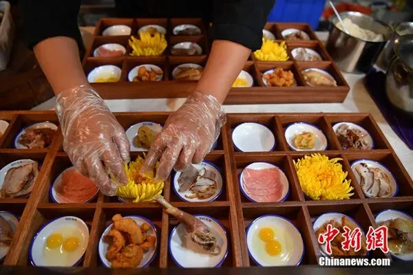 图为丰富的食材放入95摄氏度热汤中。刘冉阳 摄