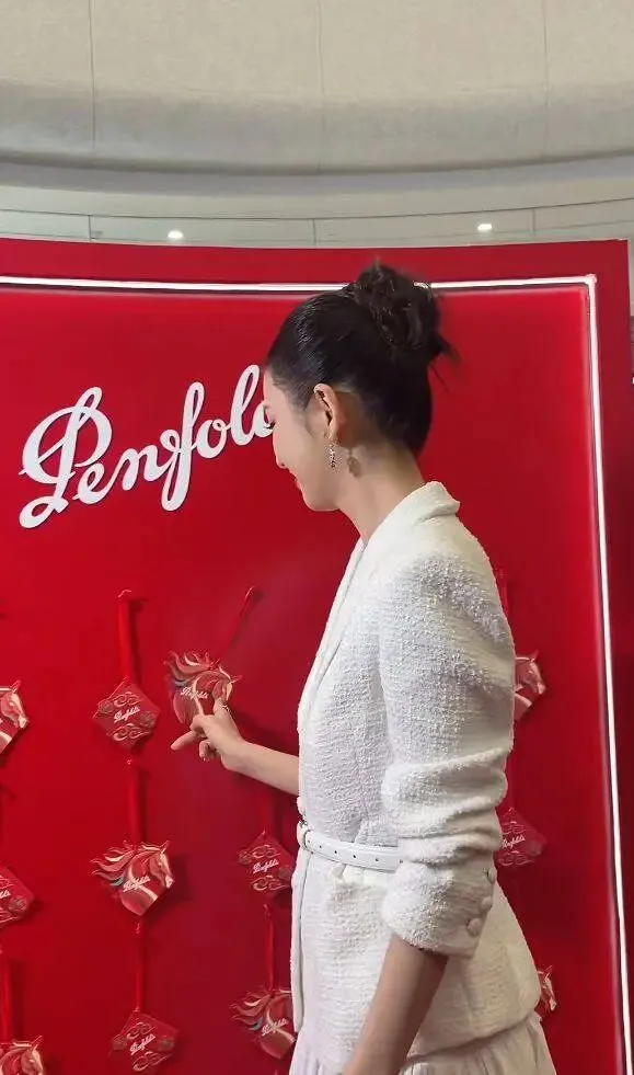 妆容选了亮眼的红唇,色调刚好和背景的红色呼应,既提亮了整张脸的气色,又没抢过白色造型的风头。配饰做得格外简洁,没有多余的装饰,让造型的质感更集中,站在红色背景前,肤色被衬得更匀净,明艳的气质完全散开。