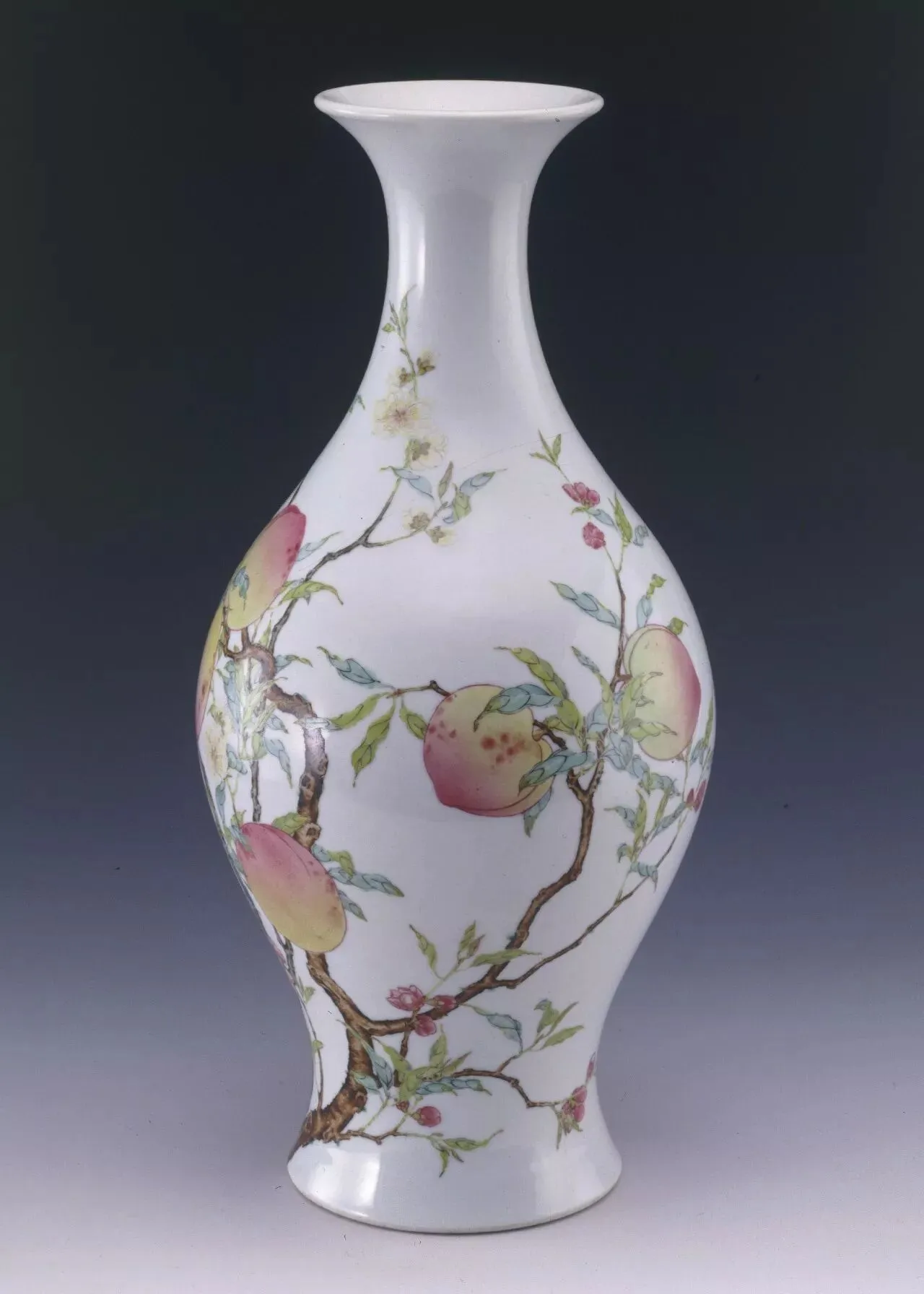 受珐琅彩的影响,康熙晚期又创烧出新的品种——粉彩。粉彩,是在彩料中加入了三氧化二砷(砒霜),砷的乳浊作用使各种彩料有深浅浓淡的改变;其次,用芸香油调色,使颜色柔软清丽,故又有“软彩”之称,与五彩用清水调色,称“硬彩”相对应。雍正年间,粉彩发展成熟,并发明、使用了国产的彩料。您看北京故宫收藏的“雍正粉彩过枝桃蝠纹盘”,桃寓意长寿,蝙蝠的蝠与福同音,代表“五福临门”。