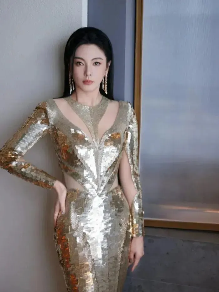 而董洁的身高则只有160cm,她不适合穿会显矮的大裙摆礼服,明智地选择了一条金色抹胸束身鱼尾裙,更显身姿。