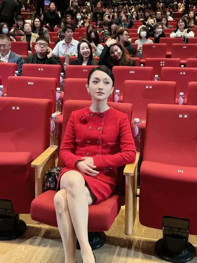周迅没有走红毯,是颁奖礼开始后才出现的,穿得比较正式,是一套香奈儿的红色套装。