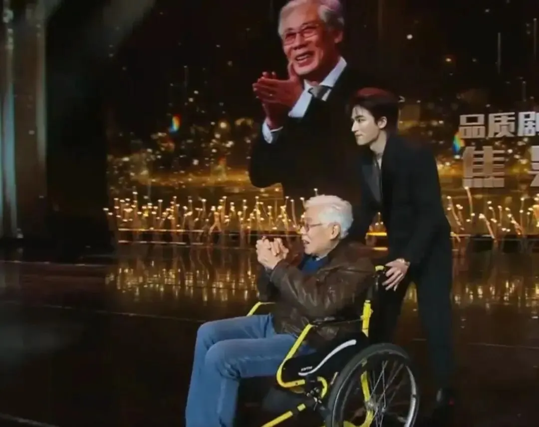 焦晃年事已高,头发皆白,是坐着轮椅被推上舞台的,但与之形成对比的,却是台下所有的明星、观众都自觉起立向焦晃致敬。