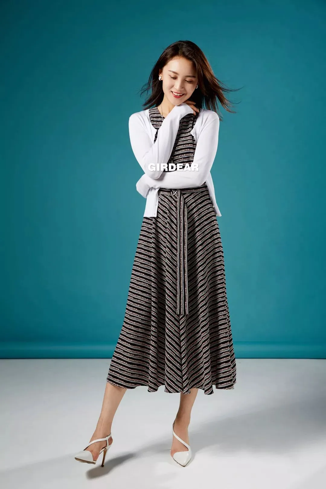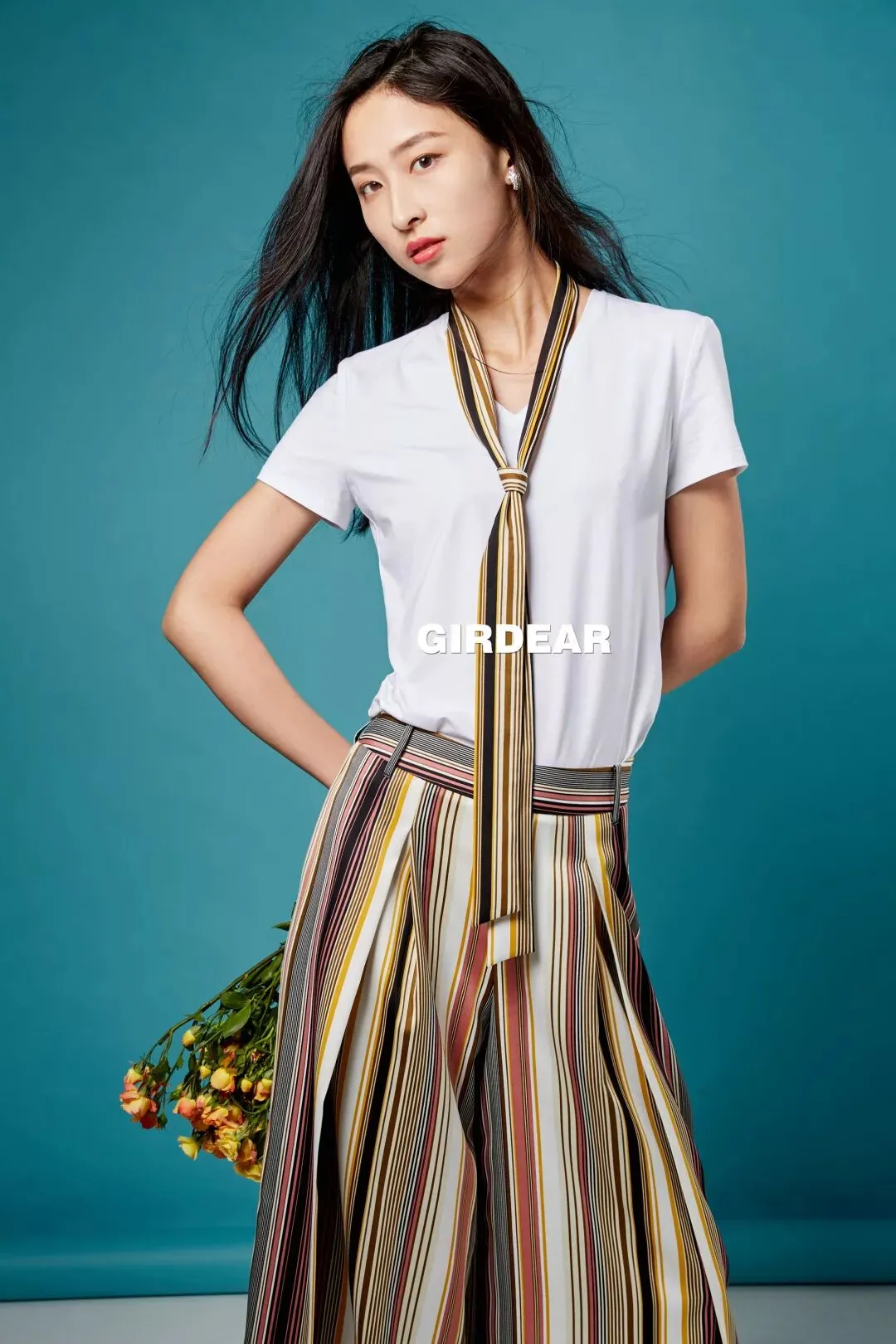 白T恤与条纹阔腿裤,一个休闲潇洒,一个稳重内敛,恰如职场女性在各种场合游刃有余的自信与实力。