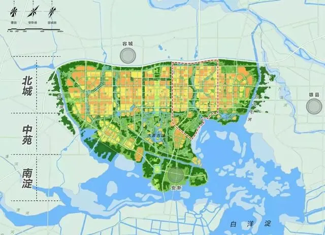 北城”即充分利用地势较高的北部区域,集中布局五个城市组团(启动区是第四城市组团),各组团功能相对完整,空间疏密有度,组团之间由绿廊、水系和湿地隔离;“中苑”即利用地势低洼的中部区域,恢复历史上的大溵古淀,结合海绵城市建设,营造湿地与城市和谐共融的特色景观。