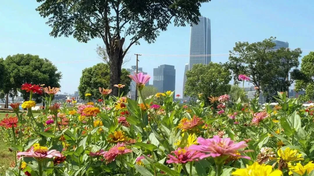 处暑时节,一同战高温的还有东岸滨江一大片百日草花海,如今花开正好。