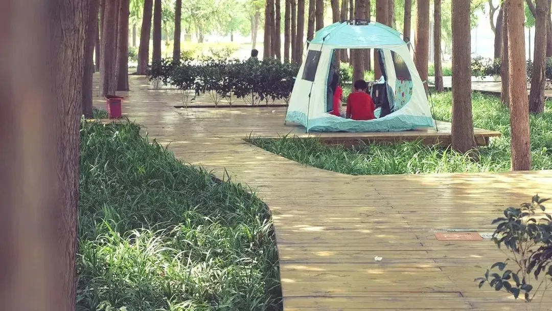和滨江大片成荫的绿地草坪或者花境不同,耀华滨江绿地的百日草花是利用木栈道和帐篷平台周边的区域布置,犹如镶嵌在栈道和平台间的一朵朵彩色精灵。