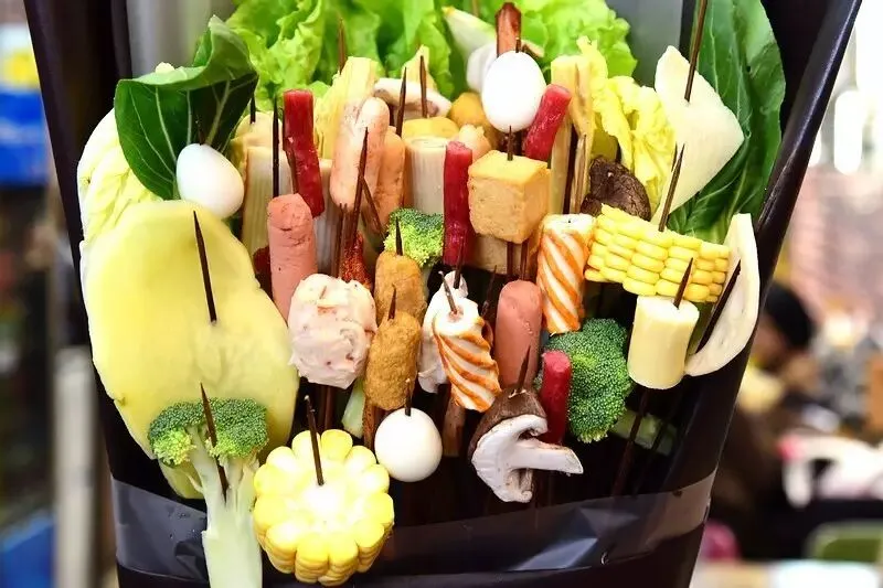 白色的芝麻,红色的汤底,五颜六色的菜品,