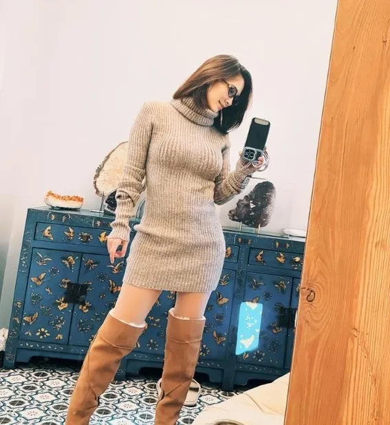 更扎心的是她那件心机毛衣裙——高领遮住产后松弛的颈纹,长靴掐住最细的脚踝,坑条纹理把视线引向S曲线!