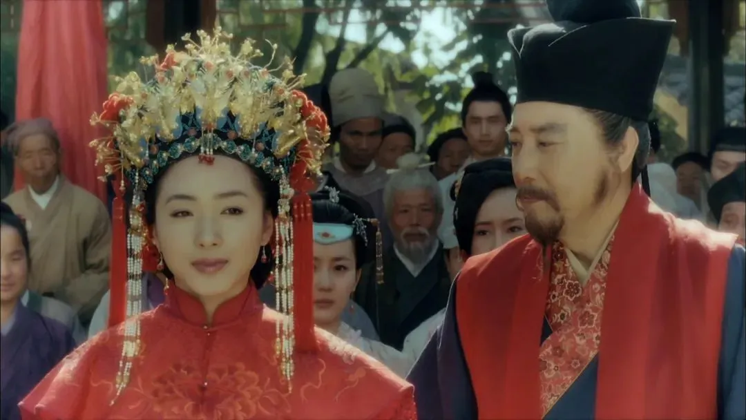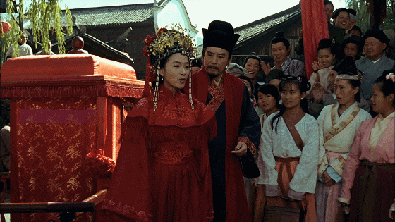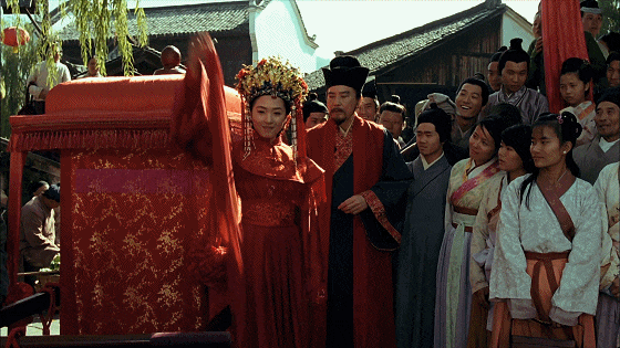 正当围观的百姓纷纷好奇,花轿里坐着个什么人物时,只见身着红底金线的刺绣霞帔的新娘,缓缓迈出轿门,一把掀下了自己的红盖头!