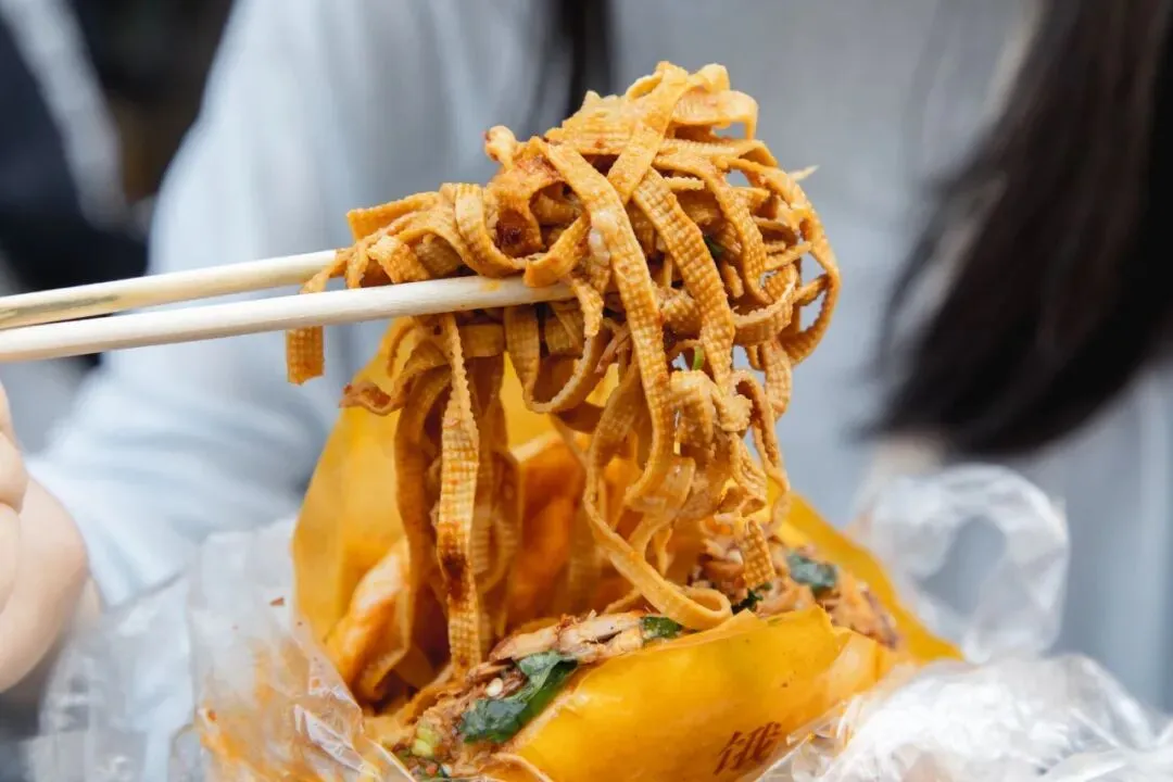 虽然这款是卷,不是“夹”,但!有什么所谓呢!都能吃!店家真的是把能卷的都卷进去了,软烂的卤肉、爽口的牛肚、香韧的鸡柳、清新的黄瓜......一口咬下去,口感层次丰富~