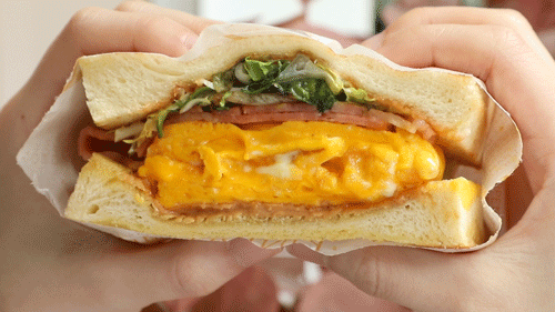 三文治一拿到手,我就知道相信我的美食雷达绝对没错啦!培根+鸡蛋是我吃三文治永恒的标配!