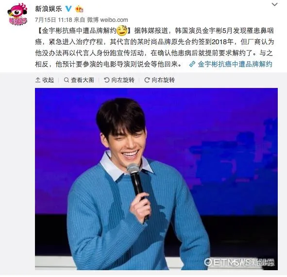 前段时间作势君刷到一则新闻,说是金宇彬今年5月确诊了鼻咽癌,而他代言的时尚品牌却在他确诊进行紧急治疗的时候,跟他提前解约了。