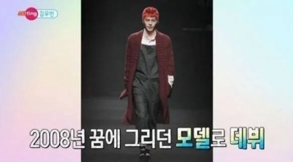 高中毕业之后,金宇彬考的是韩国大庆大学,读的是国际模特系。那时候他没资源也因为没名气而拿不到太多钱,直到他获得了一次机会去走秀,在此之后有五名设计师主动来联系他,他的模特事业才算是正式开启。